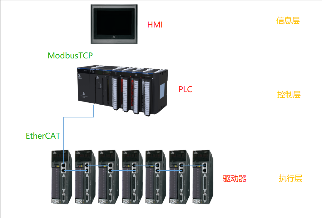 PLC通过EtherCat总线协议控制伺服,EtherCat总线的优势是通讯距离长、时间延时极小、实时性高、接线简便。