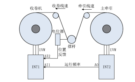 如上图所示控制模型中收卷机工作在张力闭环速度模式,收卷机接收两路AI信号,分别是反馈摆杆位置的电位计信号和主牵引运行频率信号。该控制模式原理是通过主牵引输出的模拟量信号得到频率设定值F1保证收卷电机和主牵引的线速度基本同步,再通过张力摆杆的位置反馈信号进行PID运算得到频率设定值F2保持系统张力的稳定性,最终频率输出值为F=F1+F2。