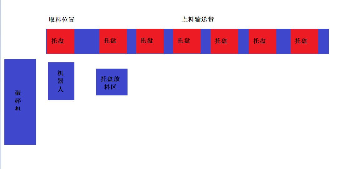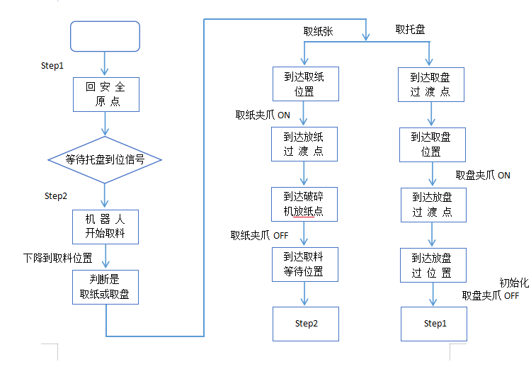 本案例中的生产线主要功能是把摆放在托盘上的纸张通过机器人搬运,摆放到破碎机中进行破碎处理,控制流程如下: