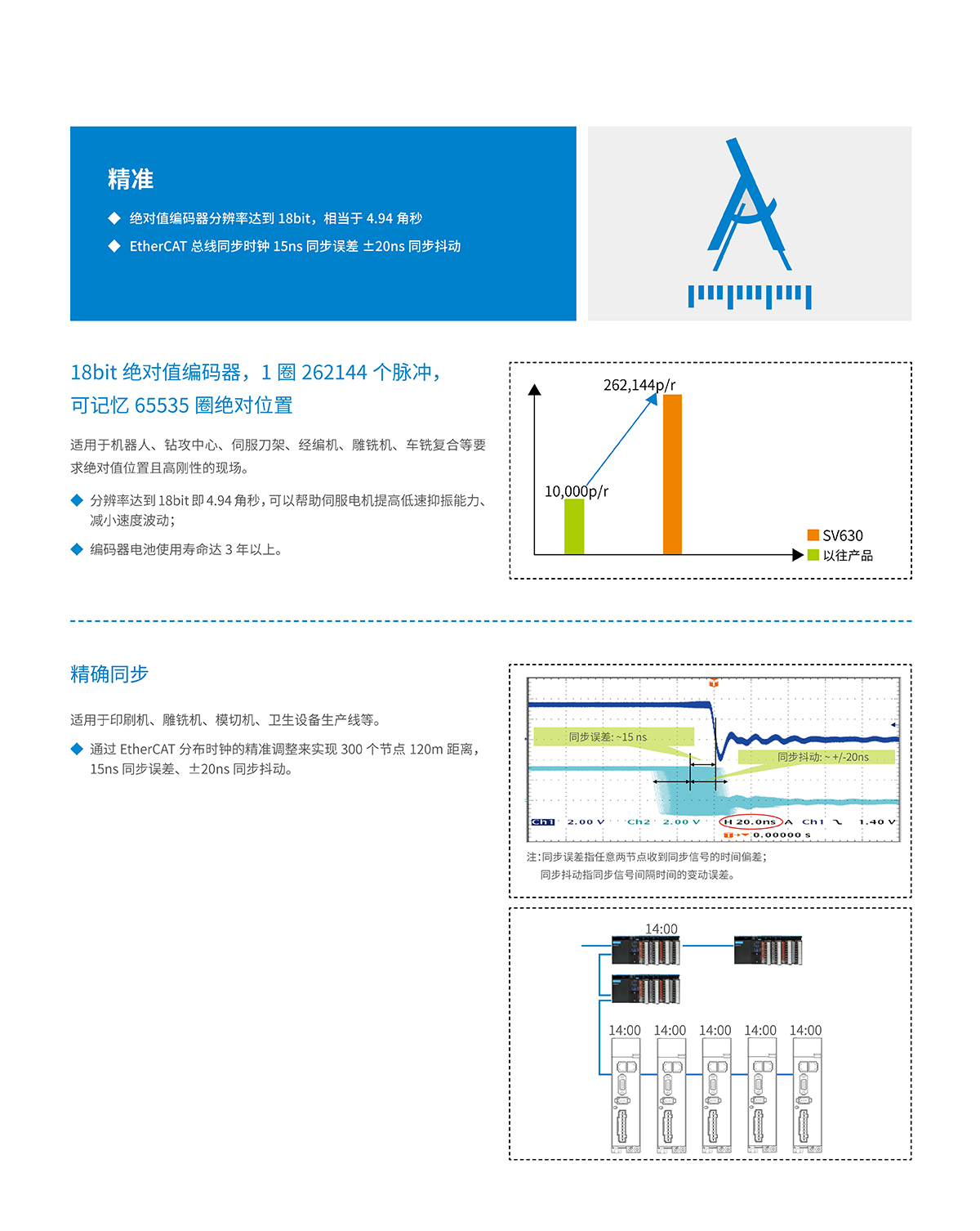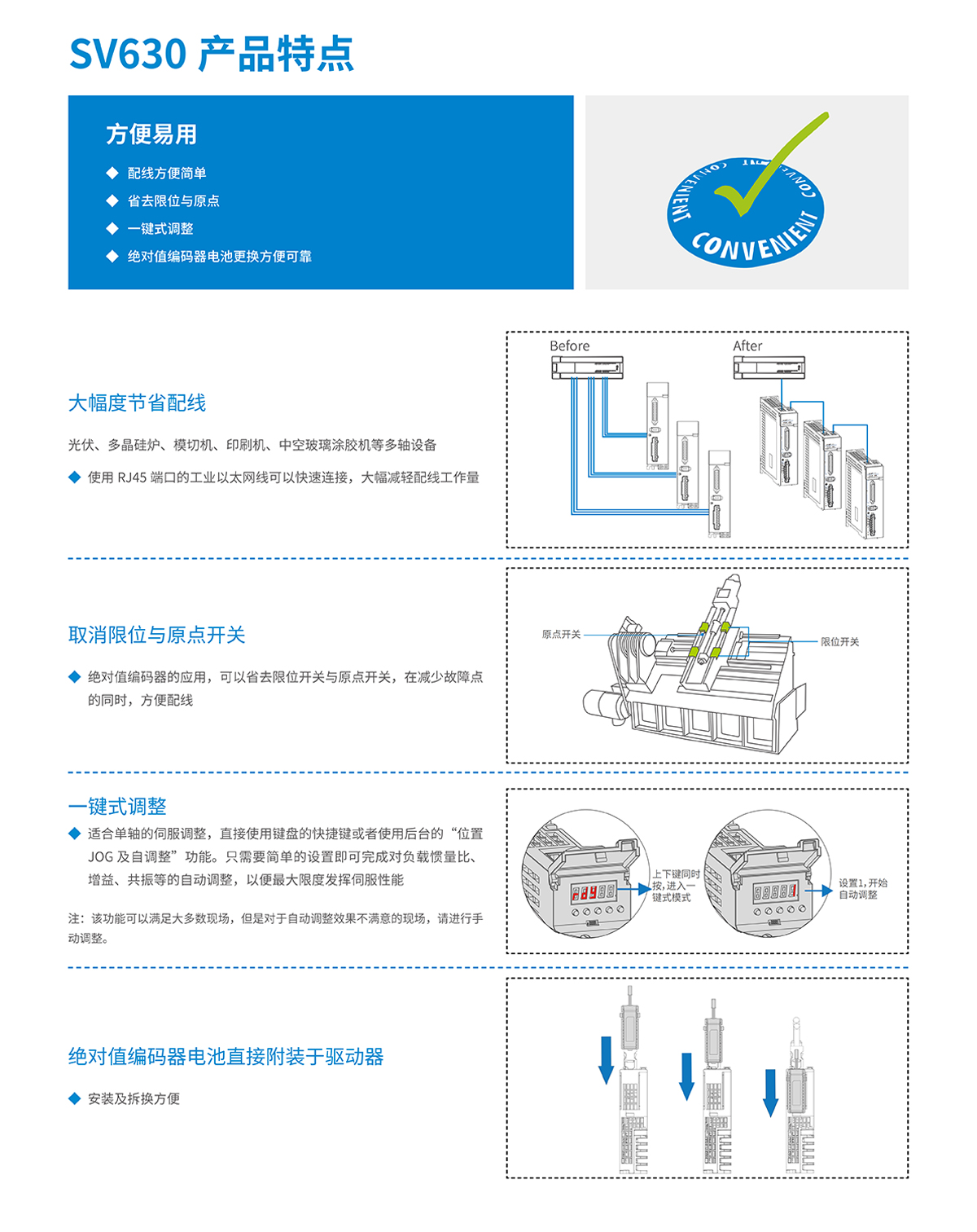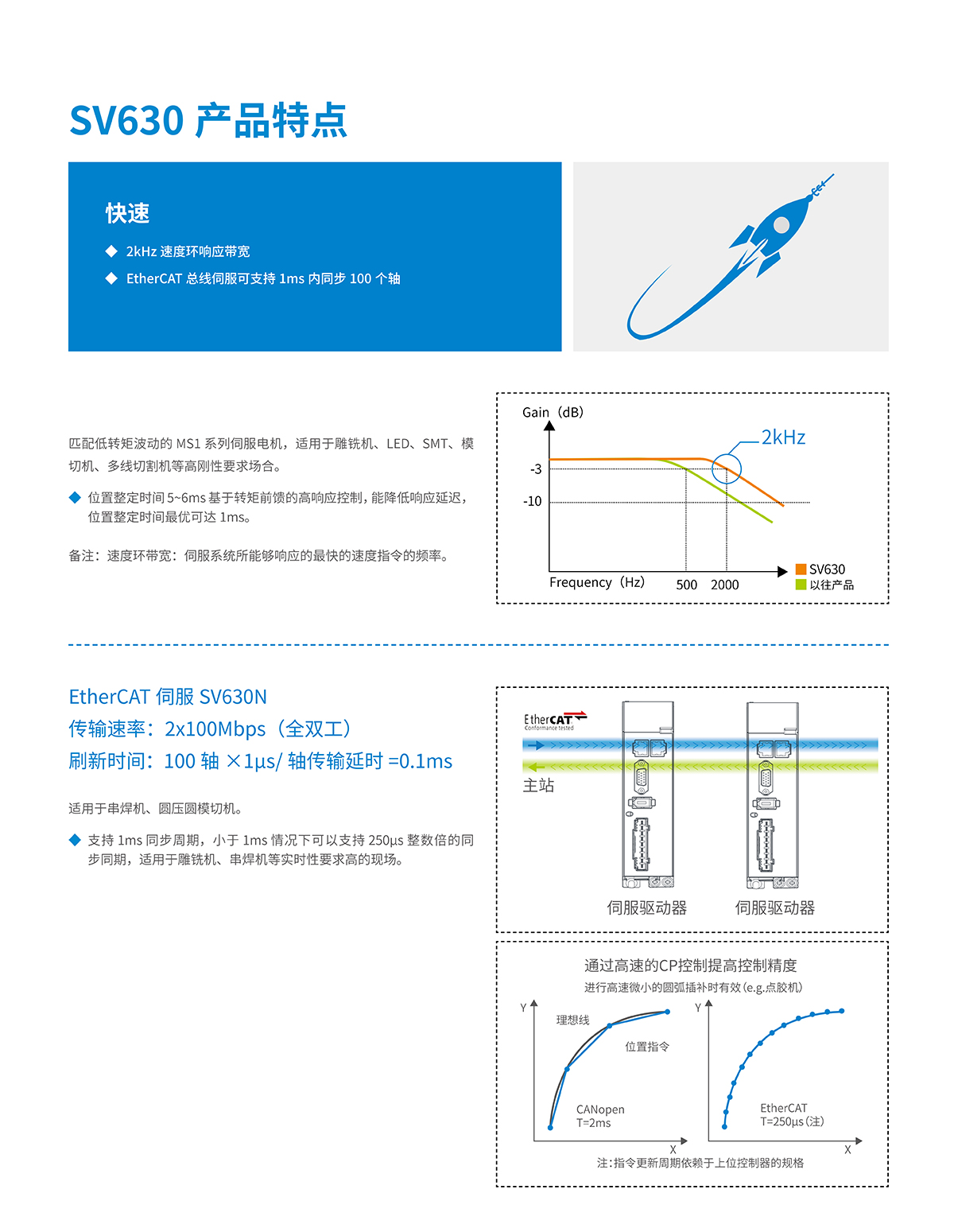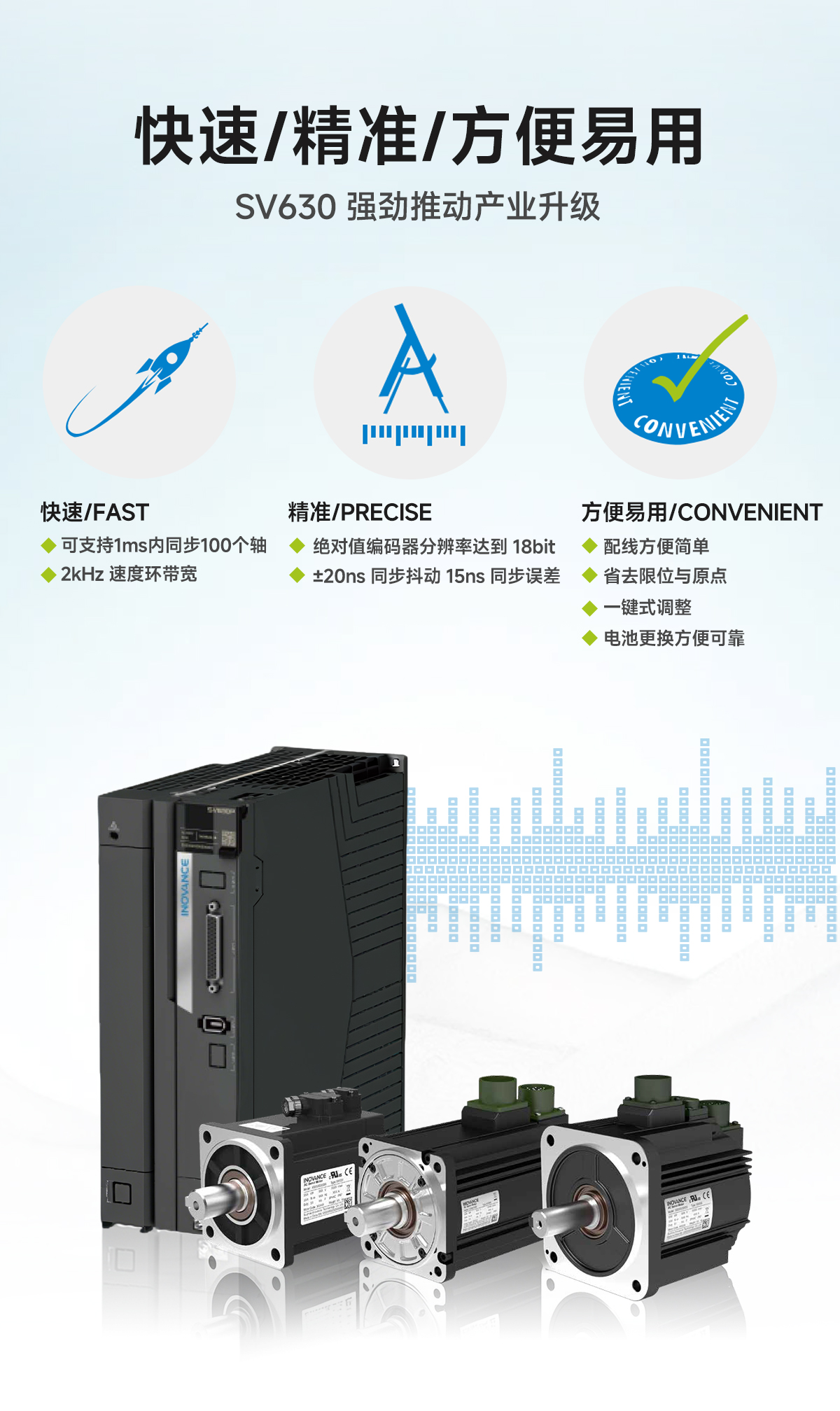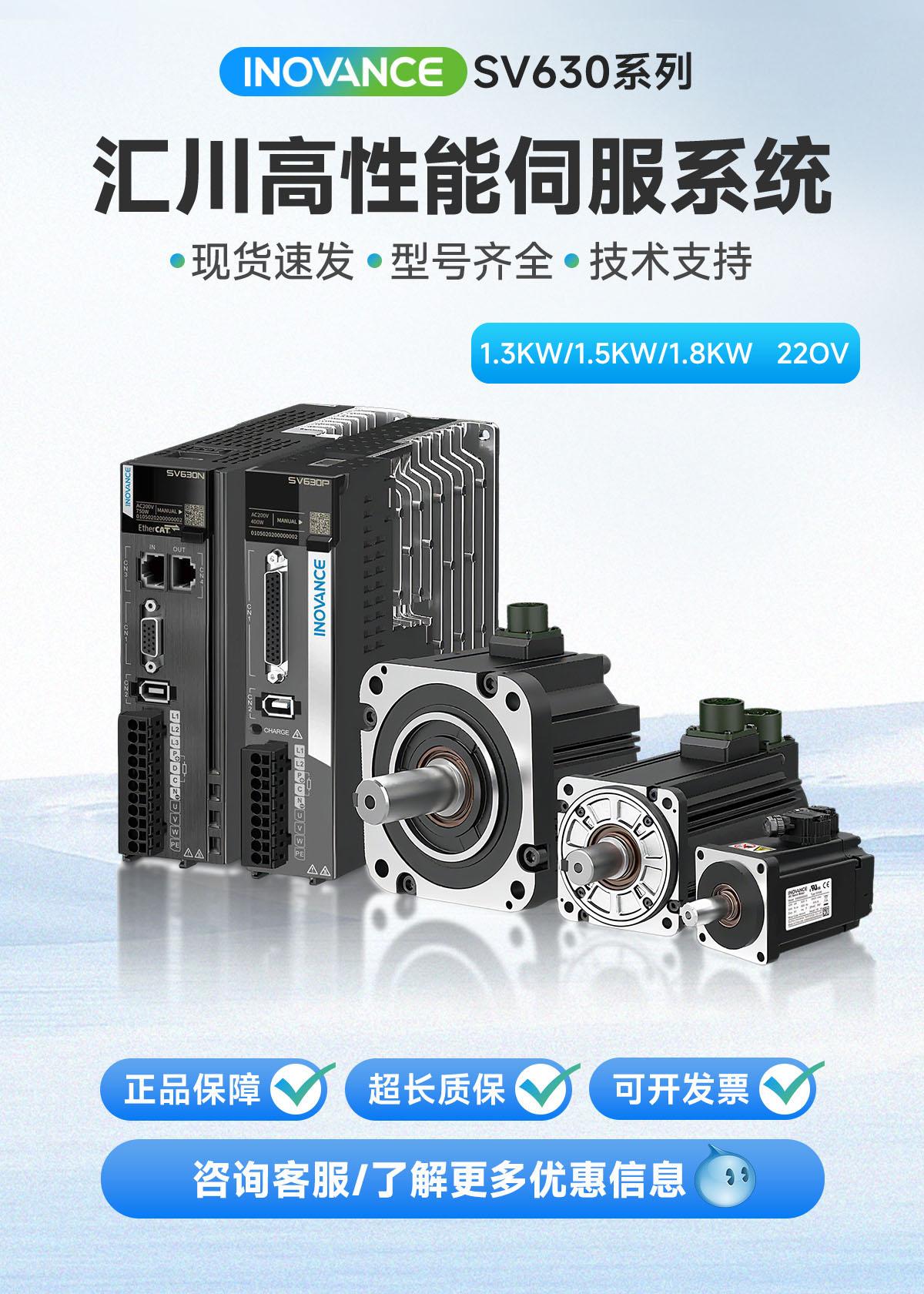 SV630 系列伺服是汇川技术研制的高性能中小功率的交流伺服产品。该系列产品功率范围为0.05kW ~ 7.5kW,采用以太网通讯接口,支持EtherCAT 、Modbus、CANopen 和CANlink 等通信协议,采用对应的通信接口,配合上位机可实现多台伺服驱动器联网运行。