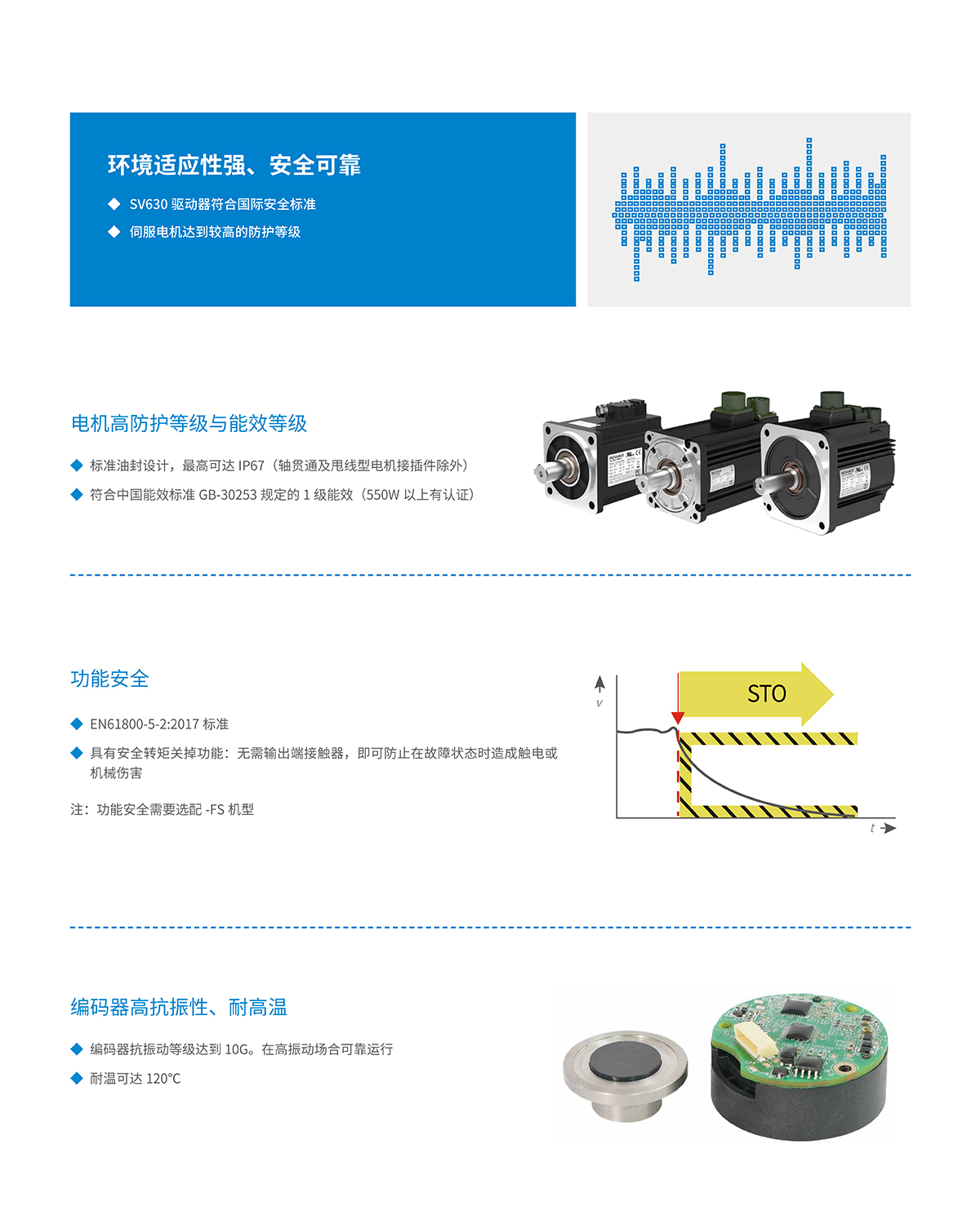 | 制动泄放功能 | 全系列支持内置制动电阻和外接制动电阻,仅 Size A 不标配置内置电阻 | |||||