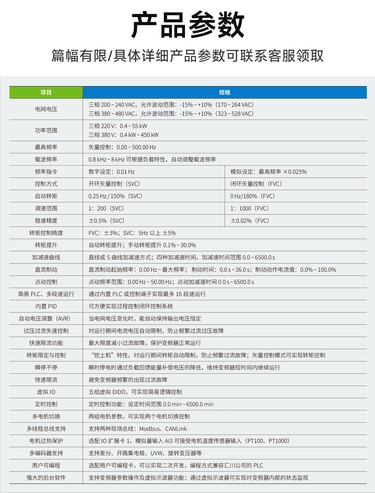 | 转矩限定与控制 | "挖土机"特性,对运行期间转矩自动限制,防止频繁过流故障;矢量控制模式可实现转矩控制 |