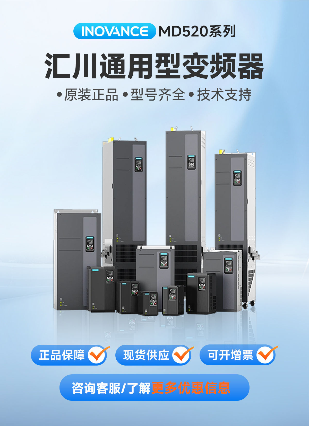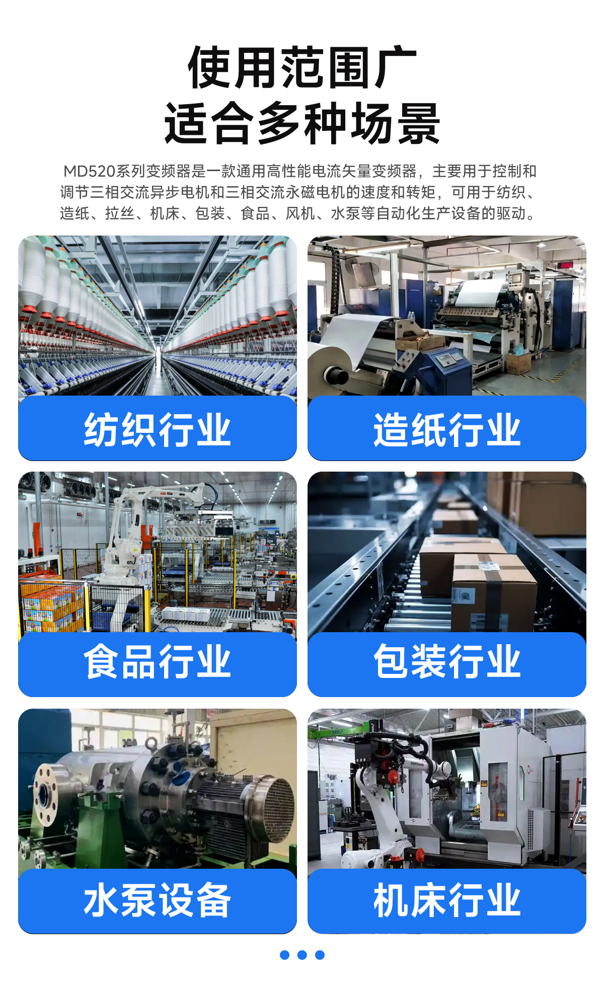 MD520系列变频器是一款通用高性能电流矢量变频器,主要用于控制和调节三相交流异步电机和三相交流永磁电机的速度和转矩,可用于纺织、造纸、拉丝、机床、包装、食品、风机、水泵及其他自动化生产设备的驱动