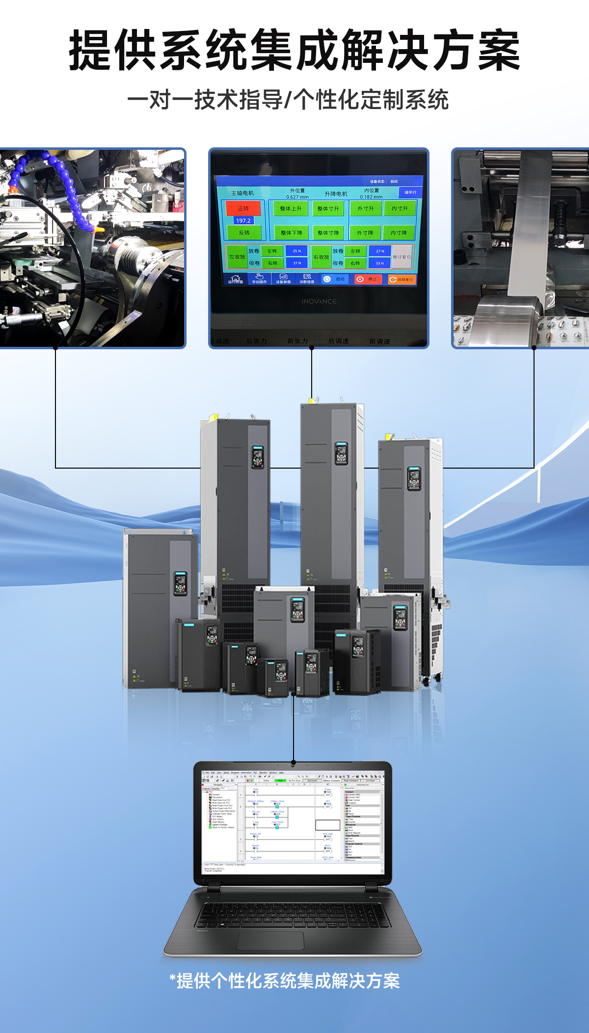 | 强大的后台 | 后台软件 InoDriverShop 支持变频器参数上下载操作及示波器功能。通过后台可支持远程调试和故障诊断。通过示波器可实现对变频器内部的状态监视 | |