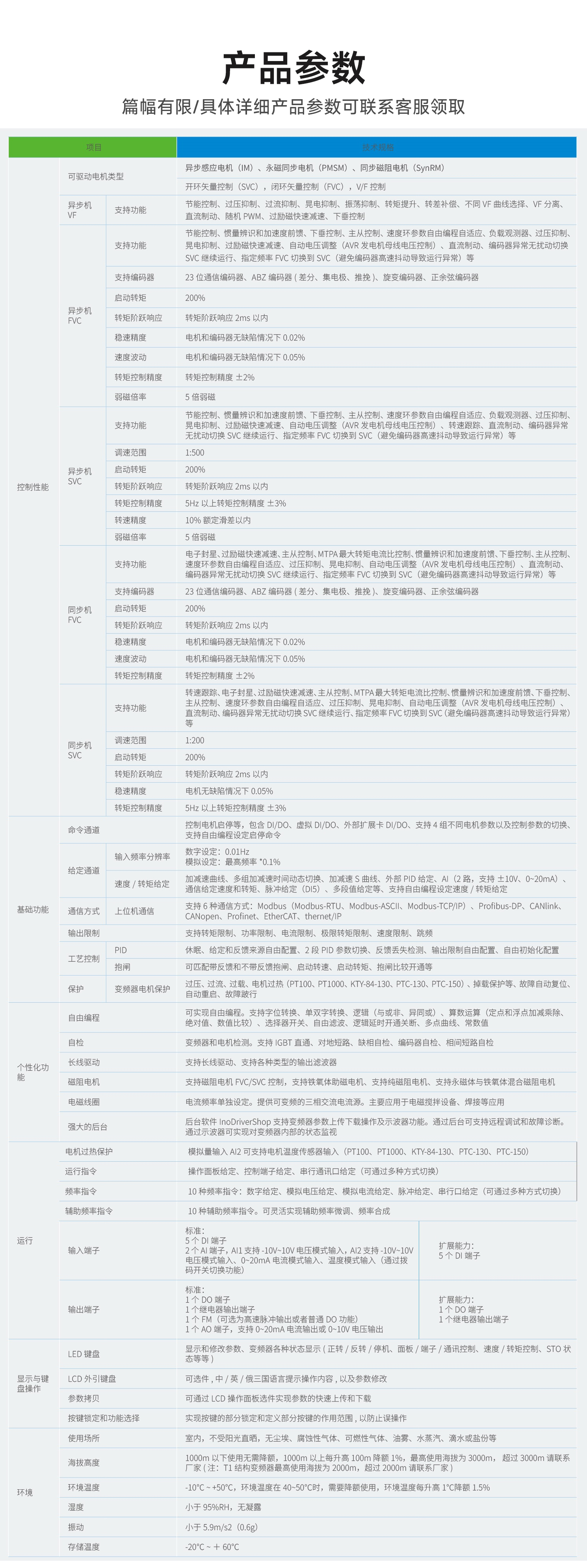 | 输出限制 | 支持转矩限制、功率限制、电流限制、极限转矩限制、速度限制、跳频 | |