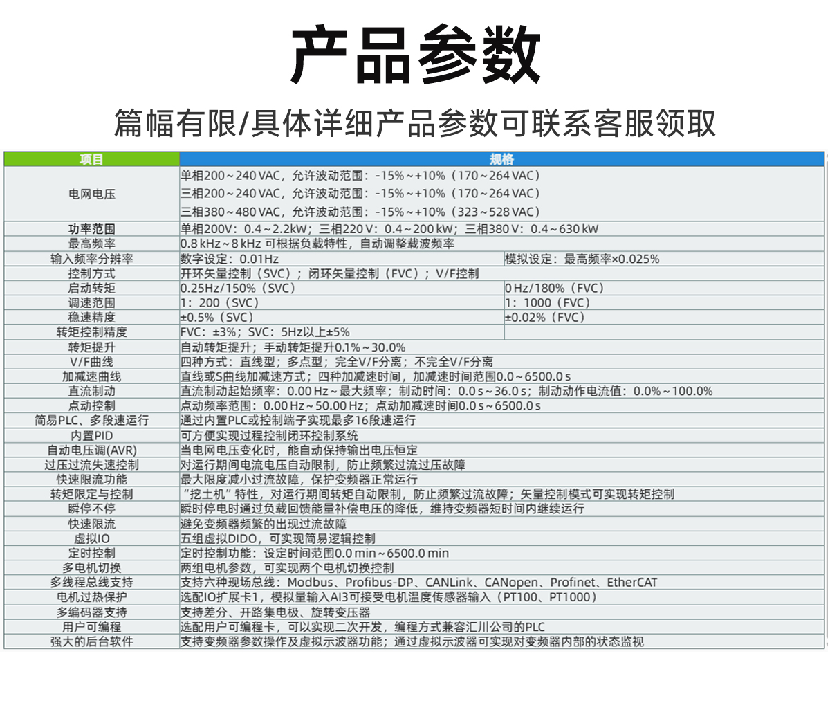 | 转矩限定与控制 | "挖土机"特性,对运行期间转矩自动限制,防止频繁过流故障;矢量控制模式可实现转矩控制 |